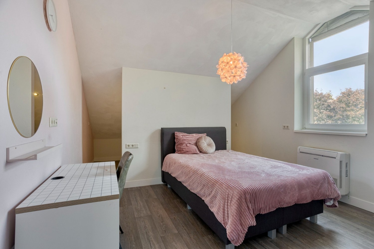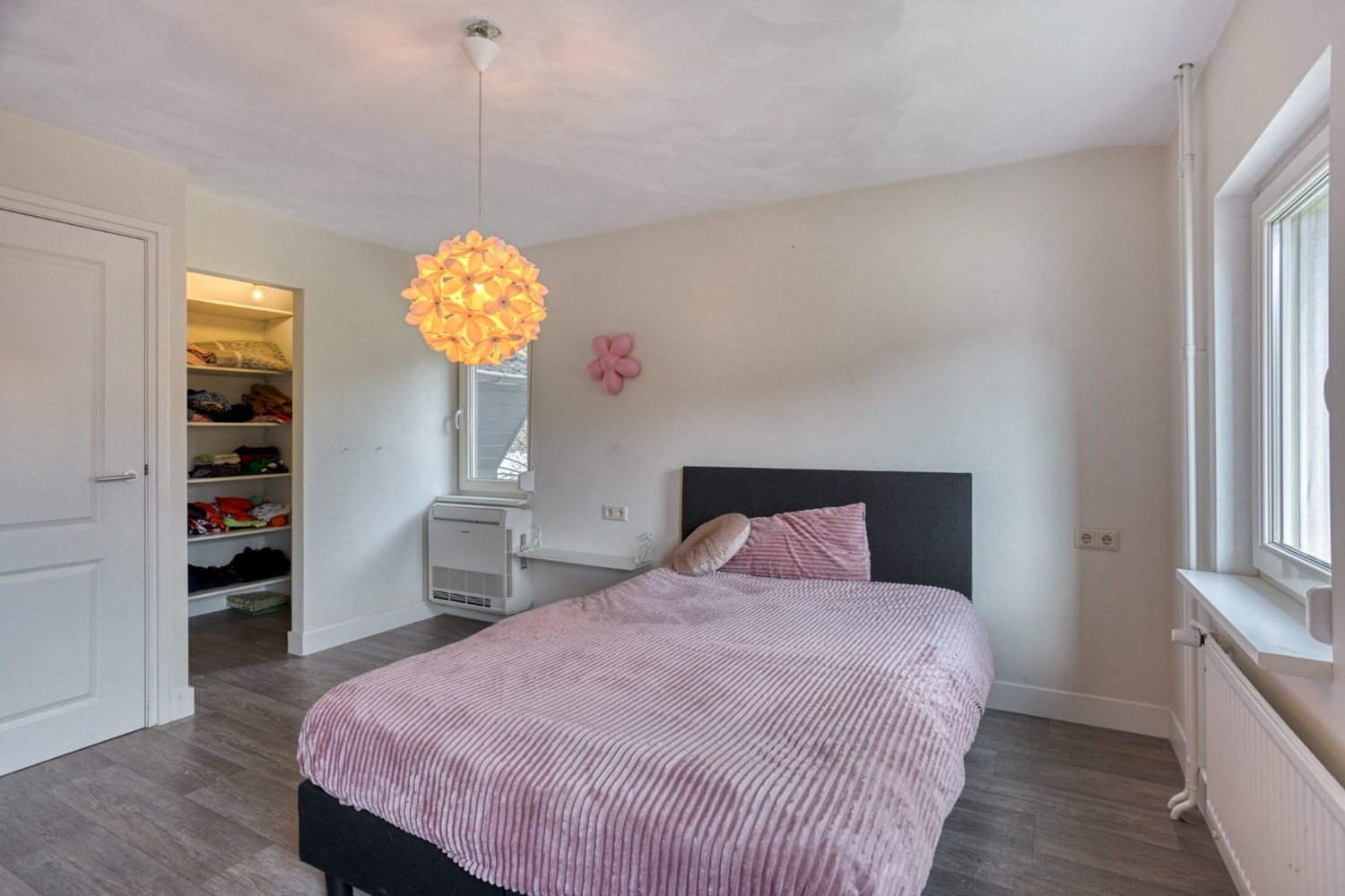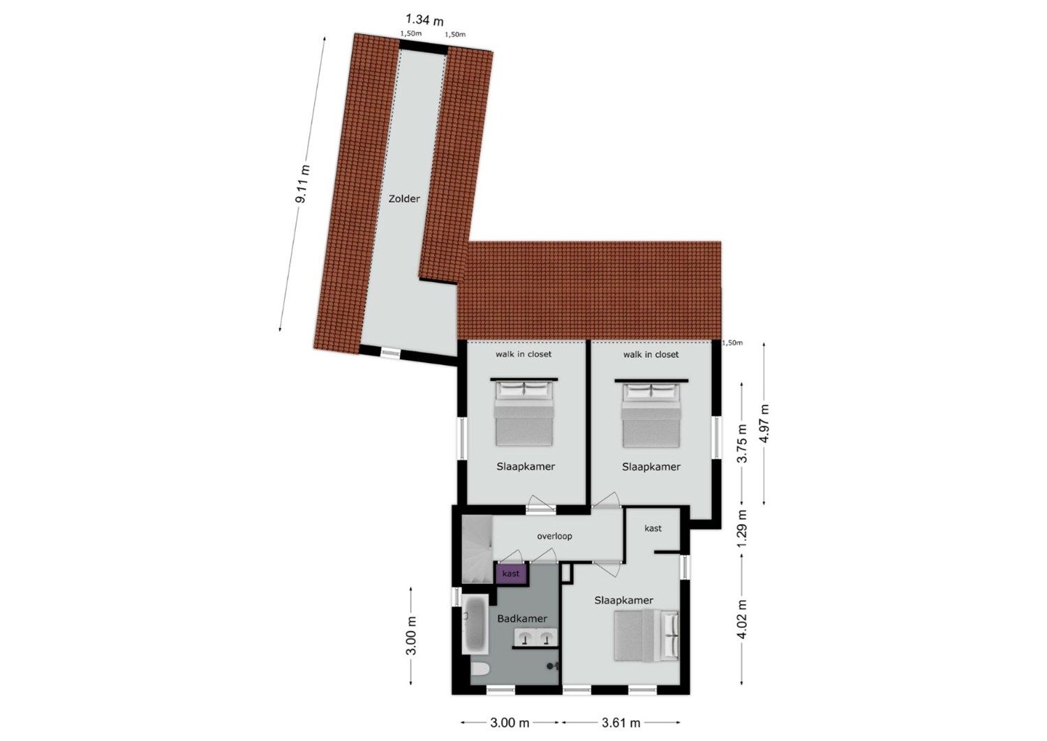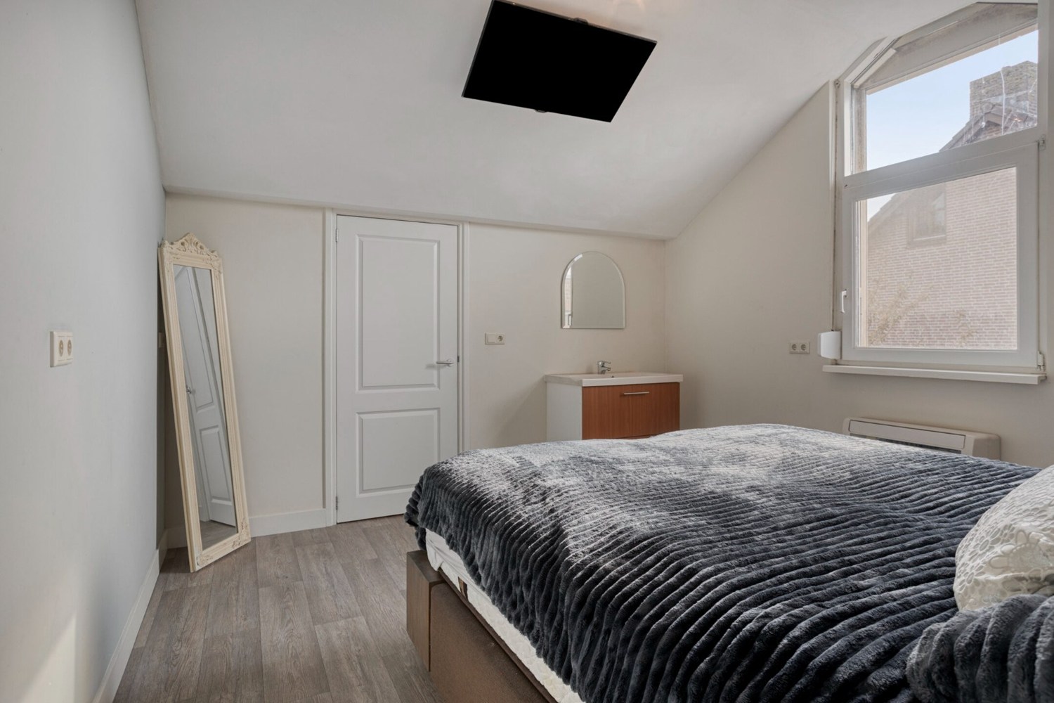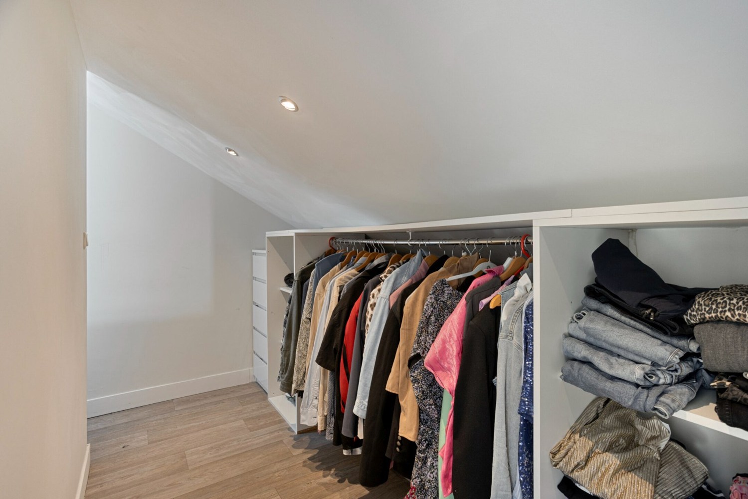 De overloop geeft toegang tot 3 zeer ruime slaapkamers en de gemoderniseerde badkamer. De slaapkamers zijn afgewerkt met een pvc-vloer, stucwerkwanden en een stucwerkplafond. De aanwezige hoogte in beide slaapkamers aan de achterzijde is erg bijzonder te noemen. Het geeft een mooi gevoel van ruimte in deze slaapkamers. Deze beide slaapkamers hebben een vaste inloopkast aan de achterzijde van het bed. De badkamer is in 2020 geheel gerenoveerd en is ingericht met een wandmeubel met dubbele wastafel, hangend toilet, ligbad en inloopdouche. Verder is de badkamer ook voorzien van vloerverwarming.