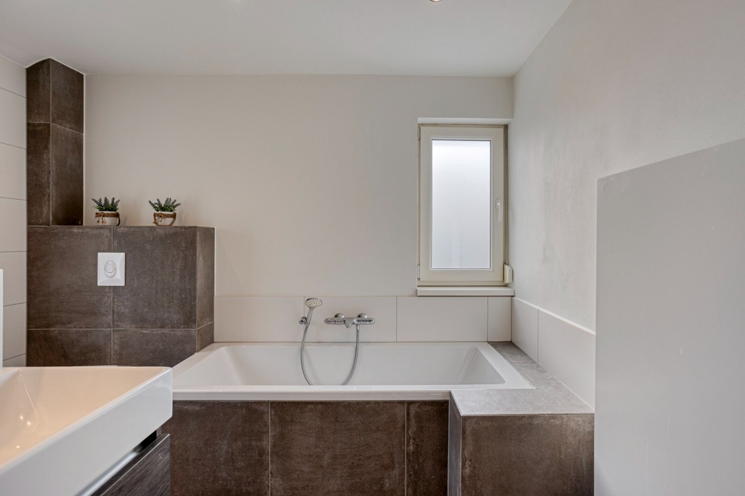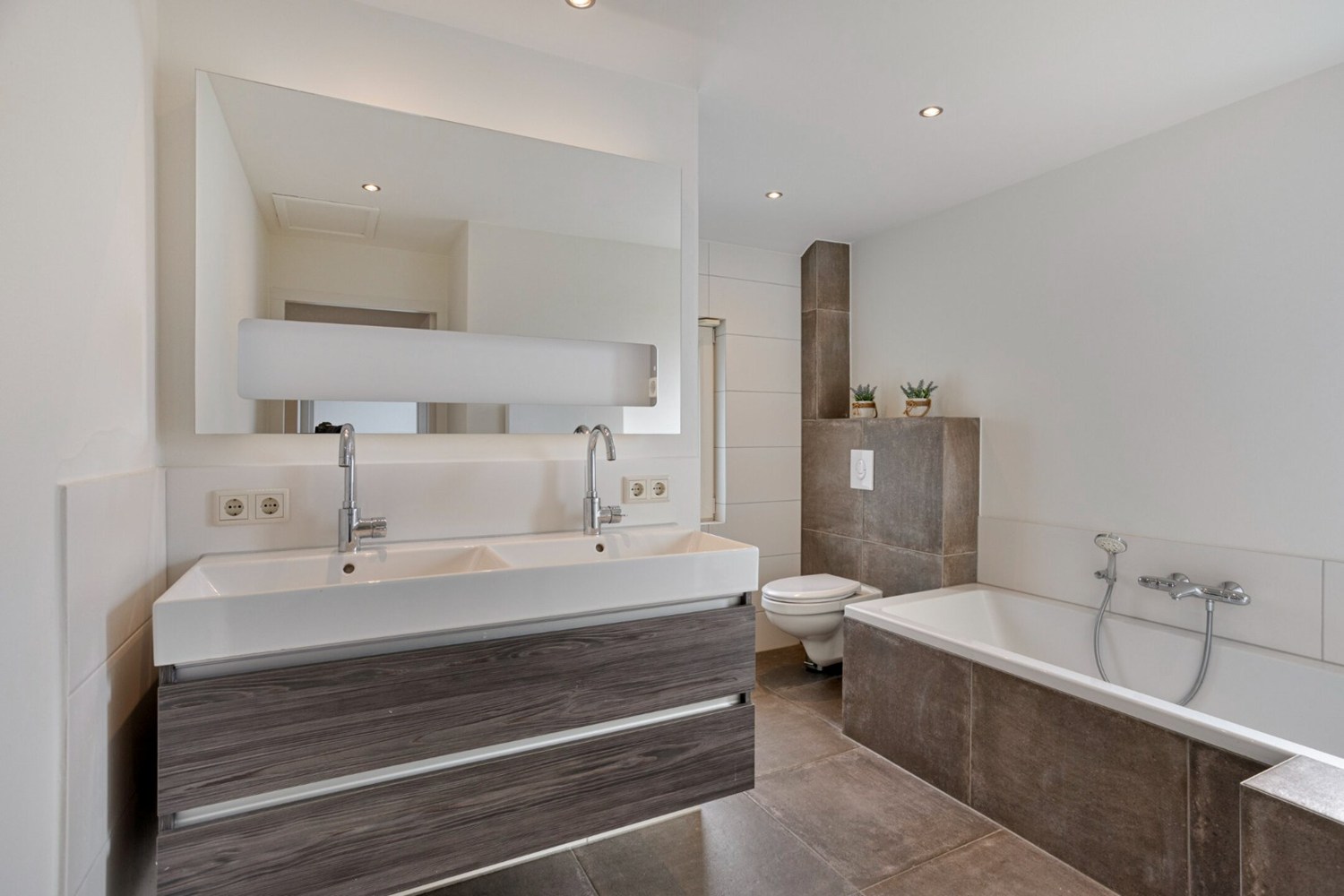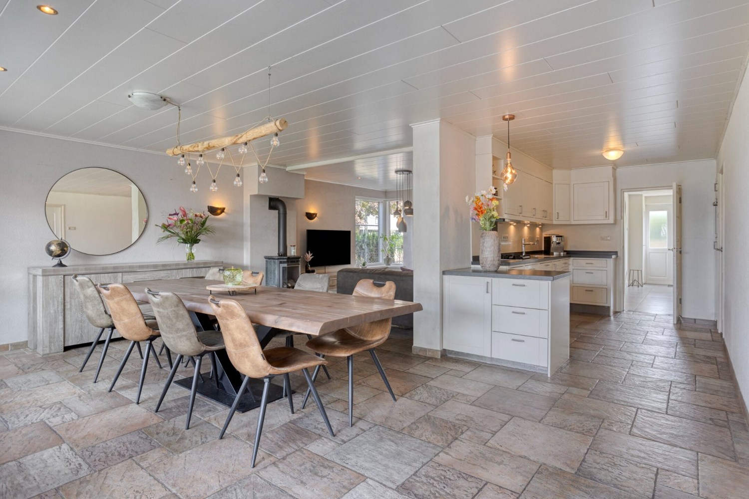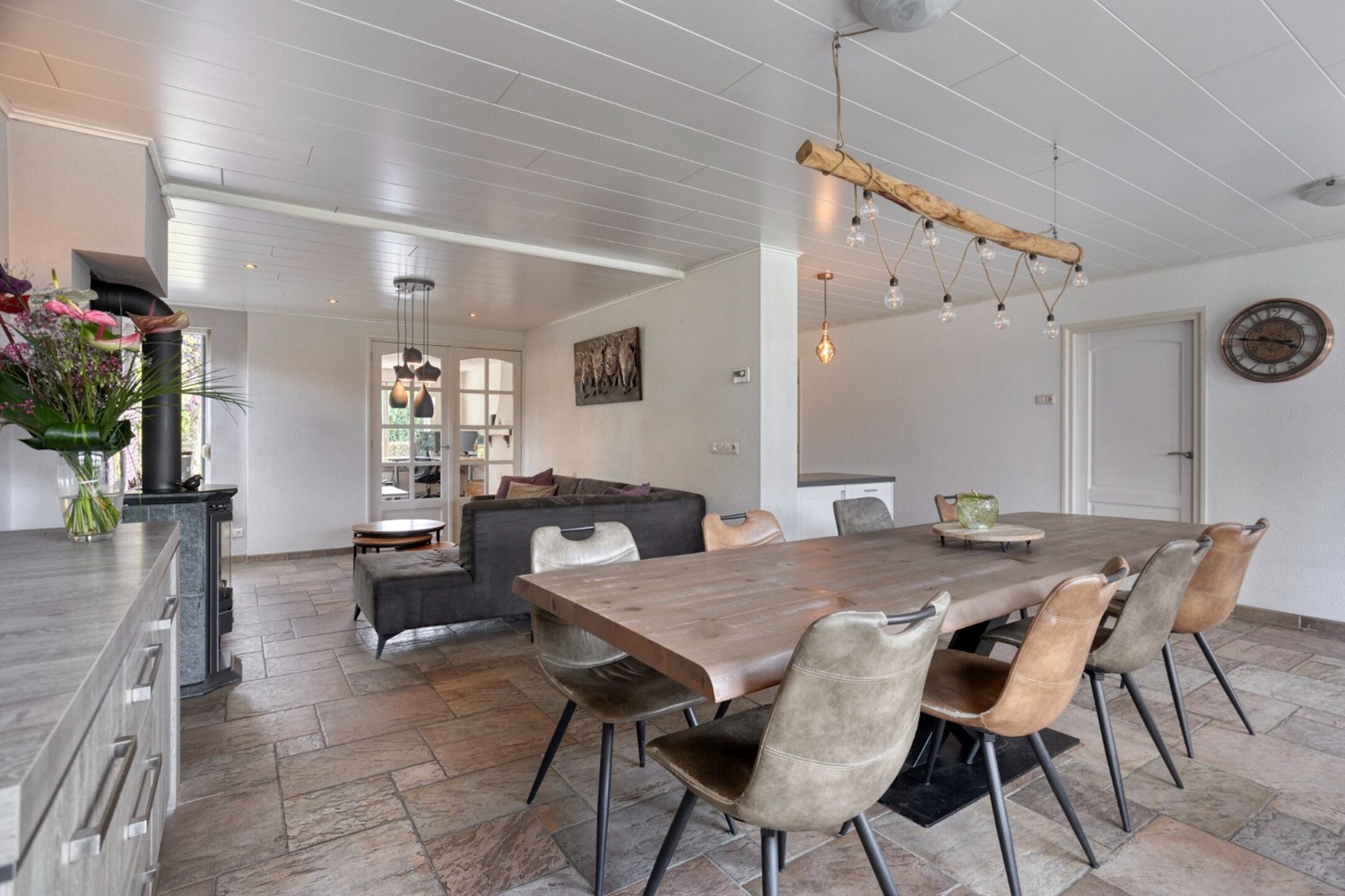 Vanuit de keuken open verbinding met het leefgedeelte ingedeeld met een ruime eethoek geschikt voor een grote eettafel en de sfeervolle zithoek met een gashaard. De leefruimte is afgewerkt met een tegelvloer met vloerverwarming en spachtelputz wanden. Dankzij de grote raampartijen en de schuifpui veel lichtinval in de leefruimte.