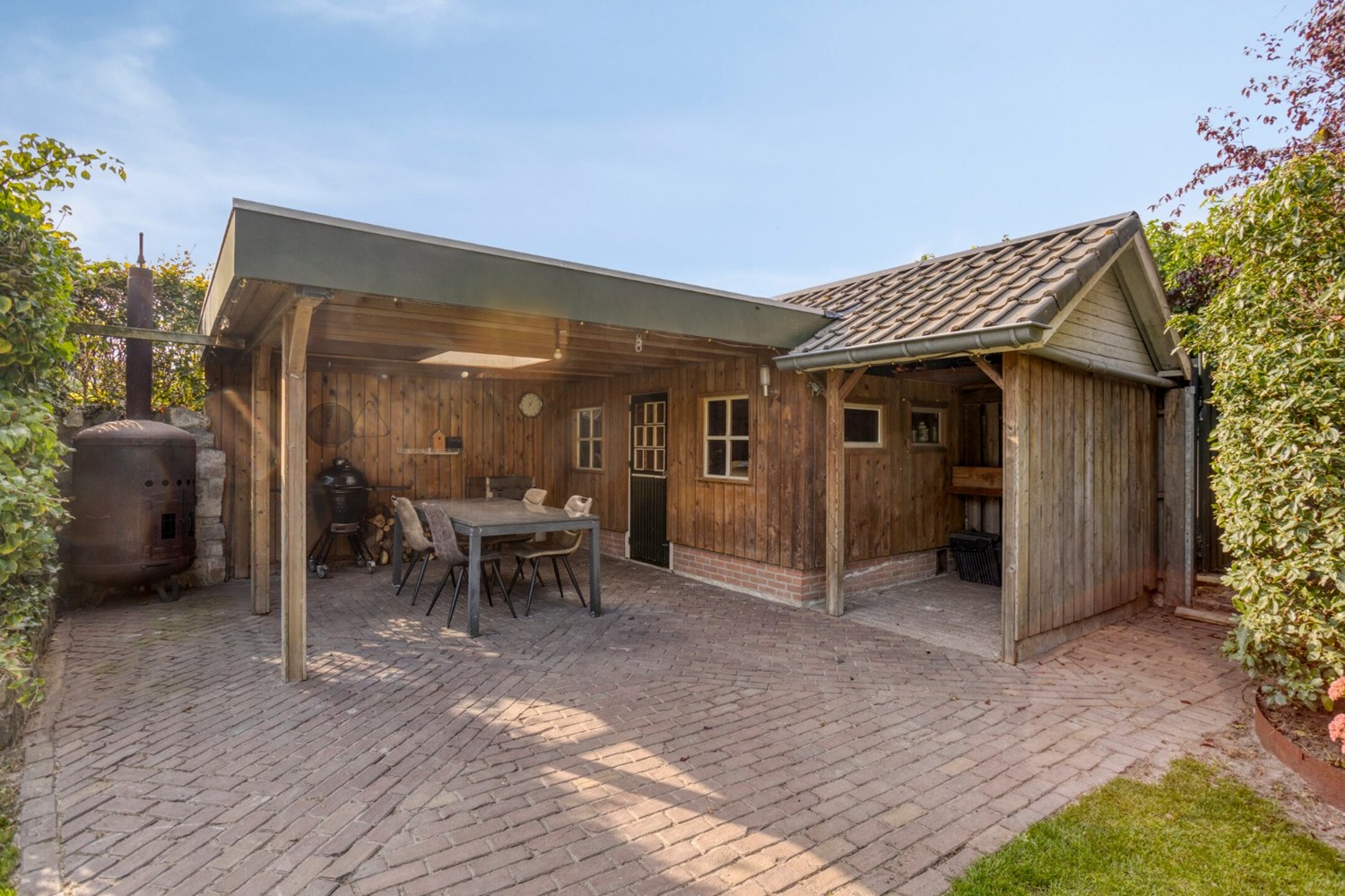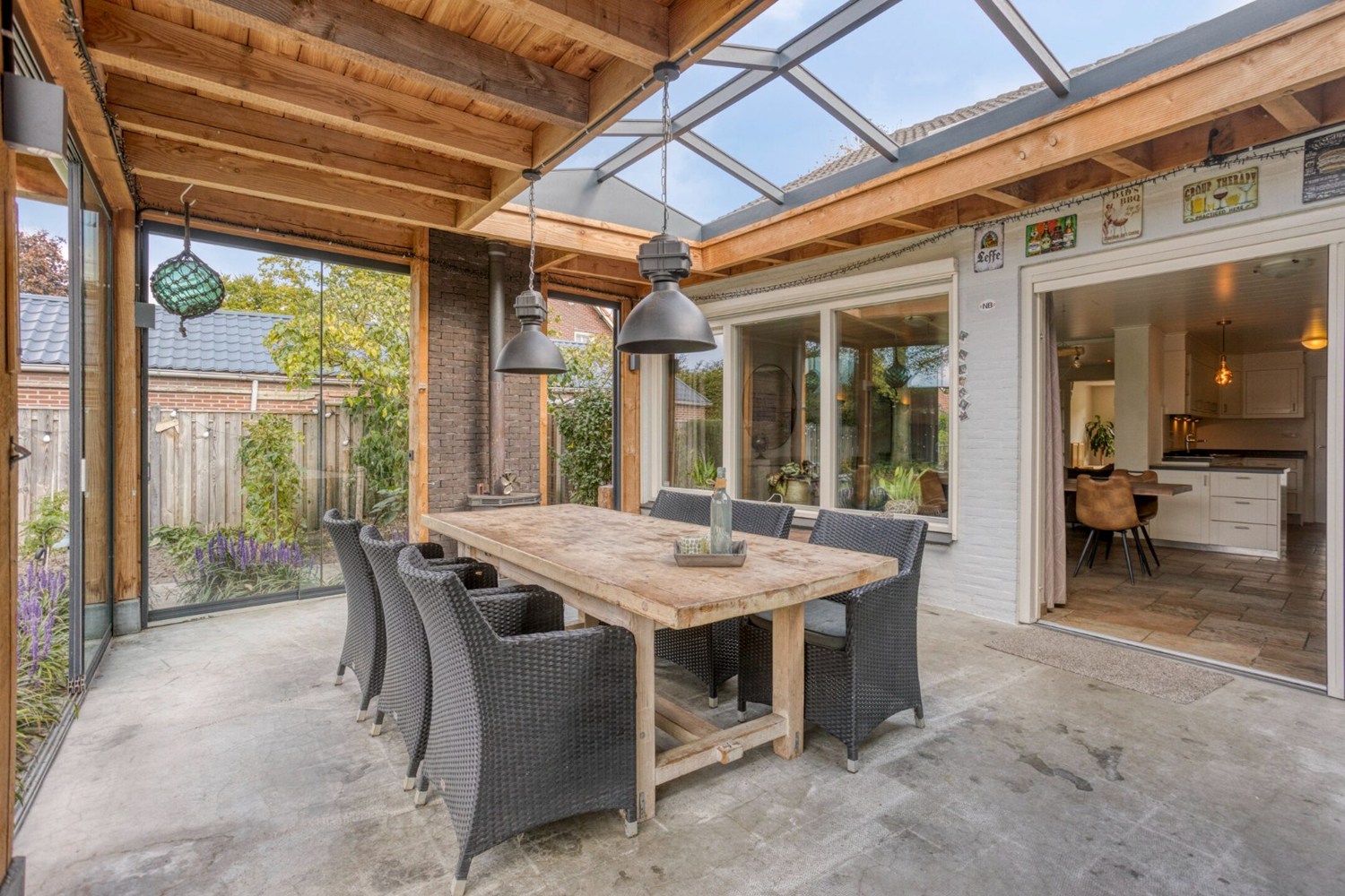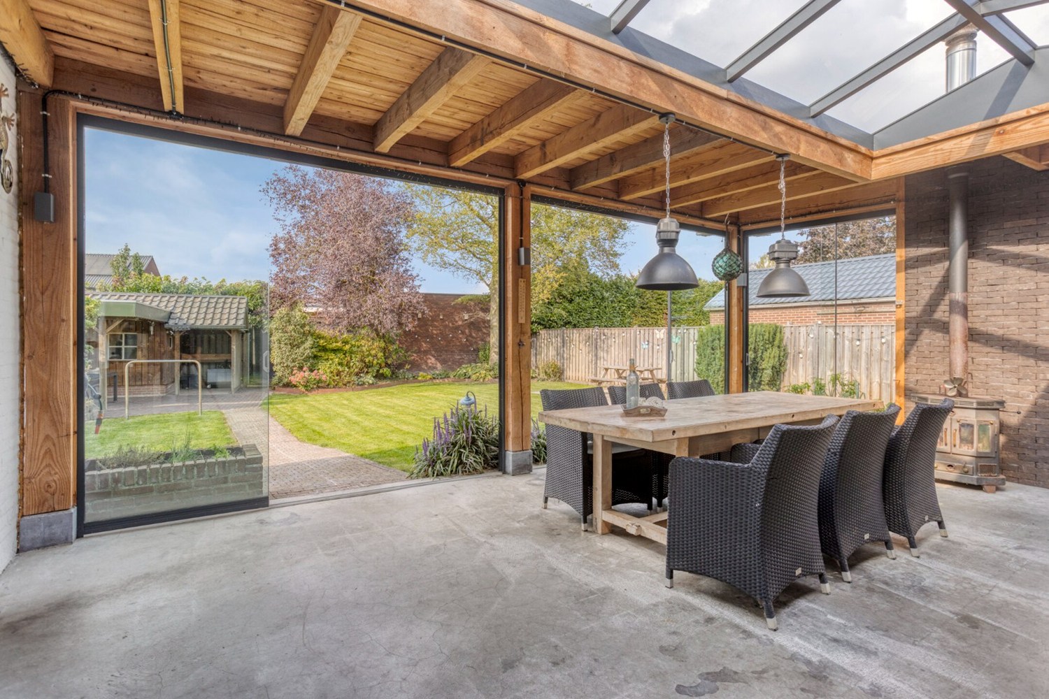 Tegen de achtergevel van de woning is een prachtig mooie overkapping gerealiseerd met grote lichtstraat en een houtkachel. Een perfect zitje tijdens de mooie zomerdagen. De overkapping is afsluitbaar door middel van glazen panelen.