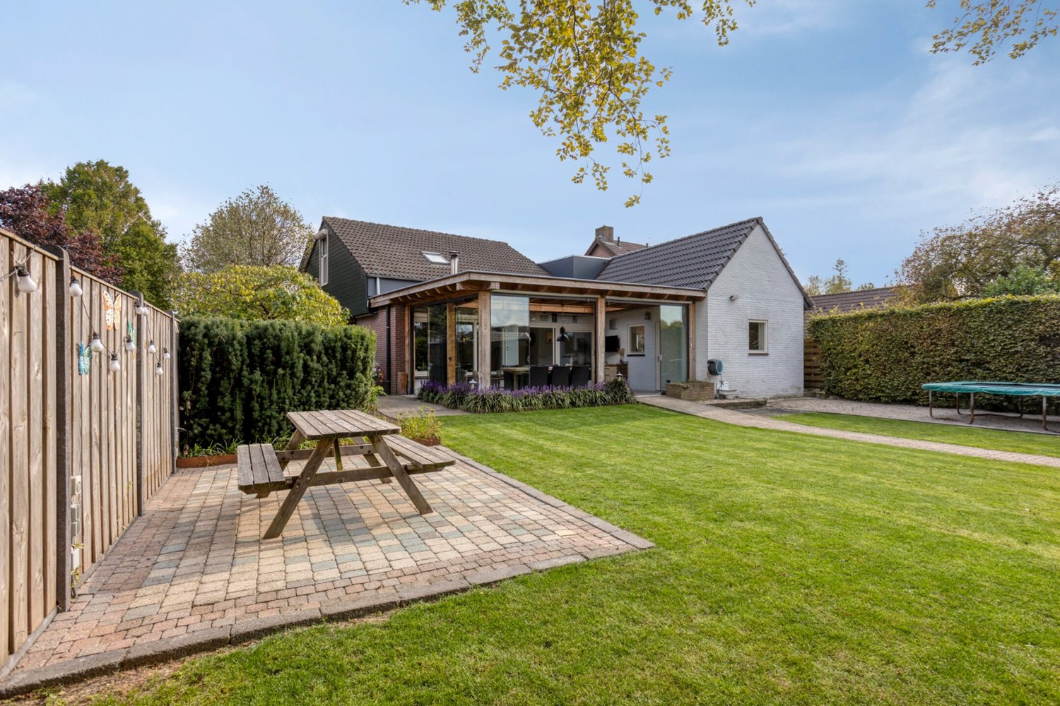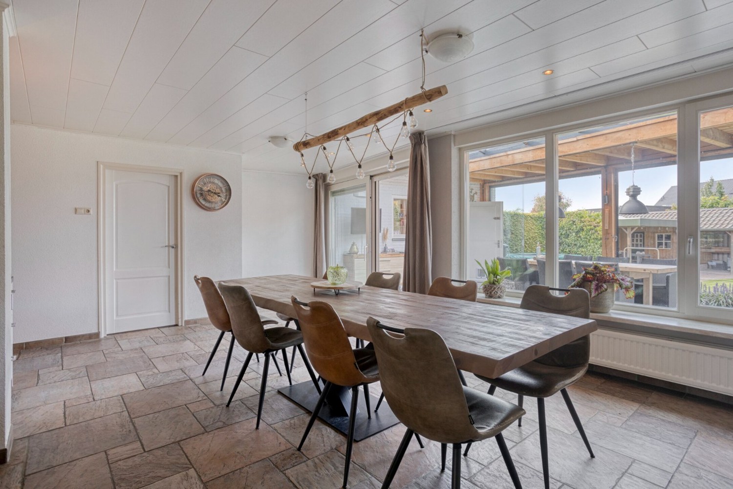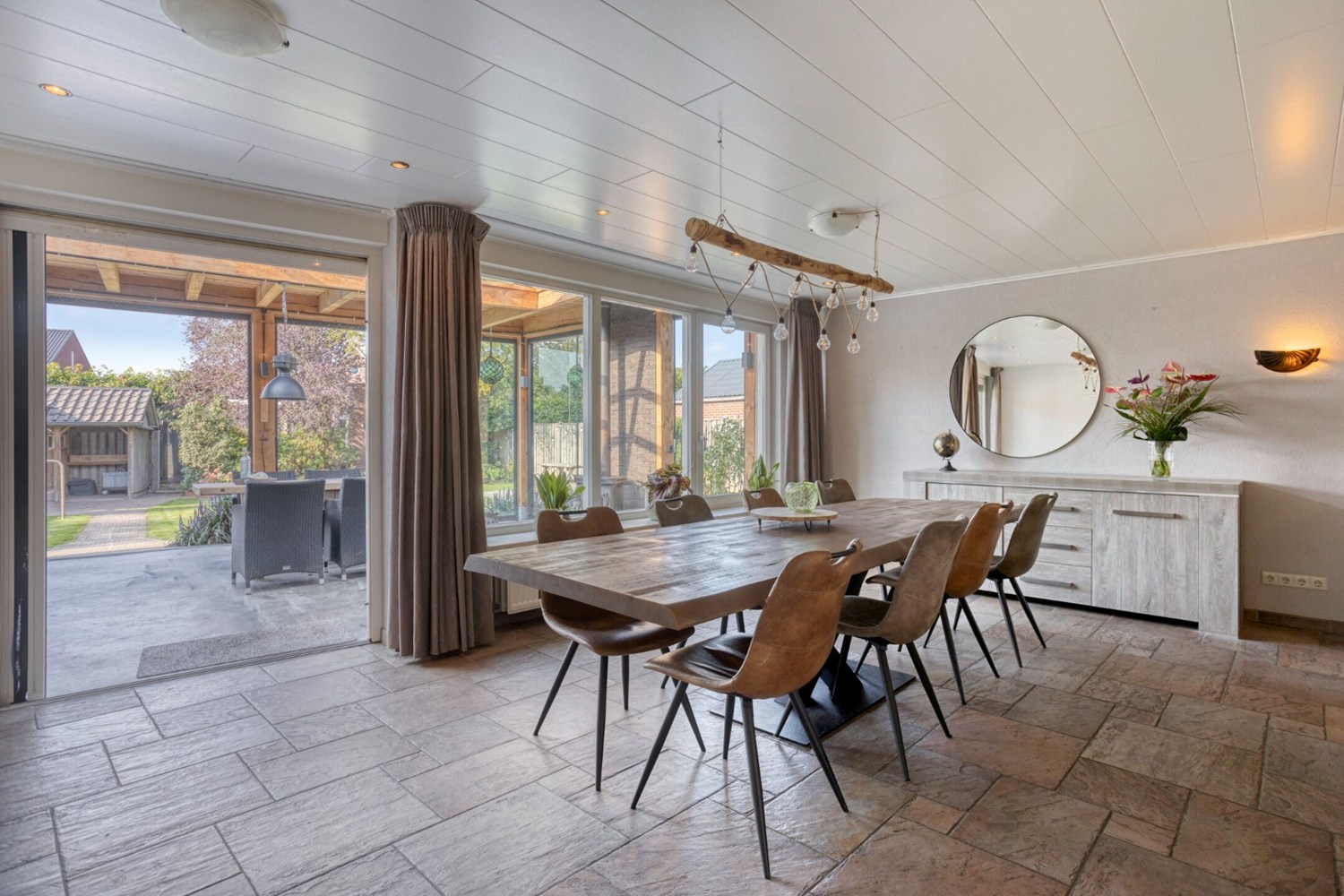 Tegen de achtergevel van de woning is een prachtig mooie overkapping gerealiseerd met grote lichtstraat en een houtkachel. Een perfect zitje tijdens de mooie zomerdagen. De overkapping is afsluitbaar door middel van glazen panelen.