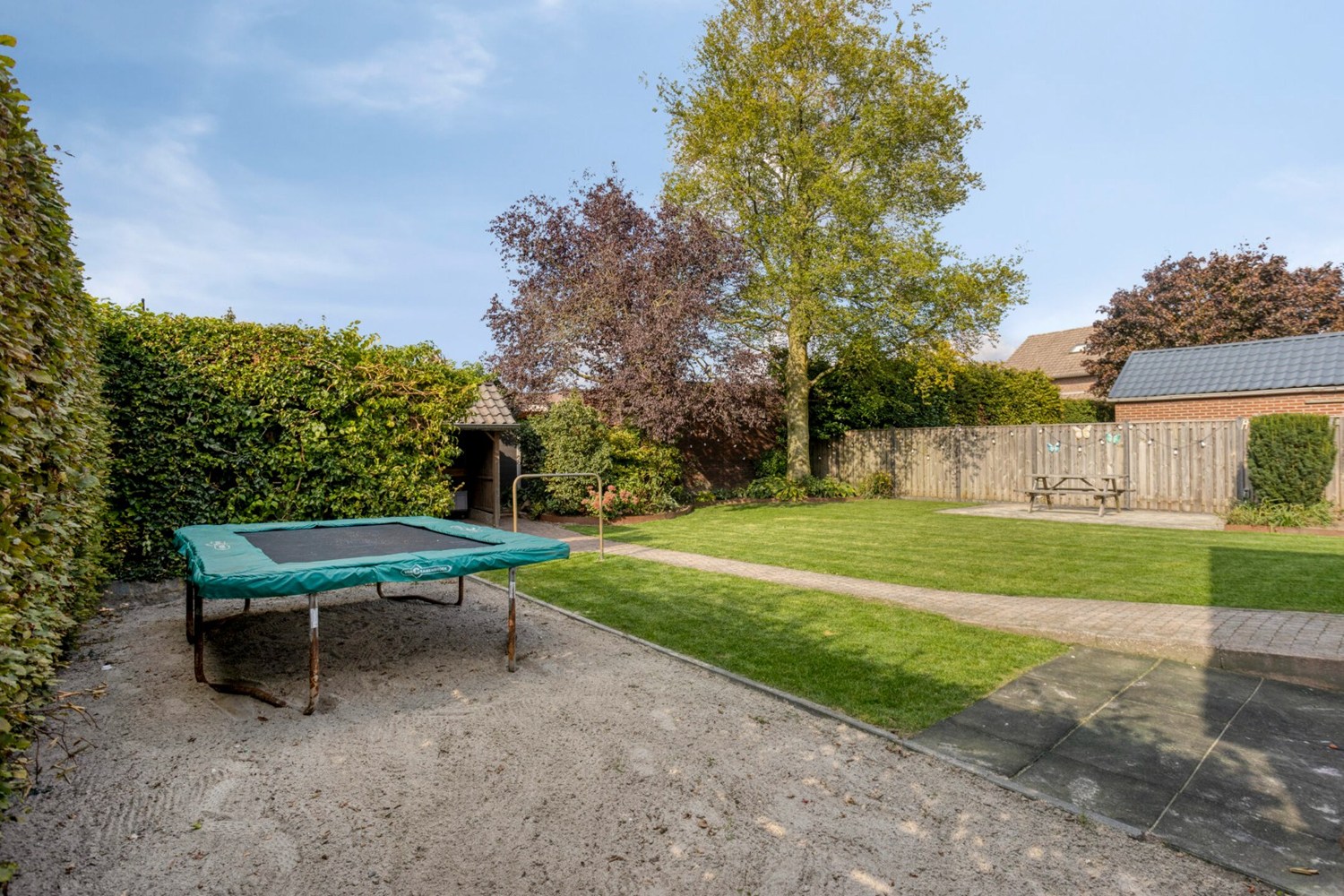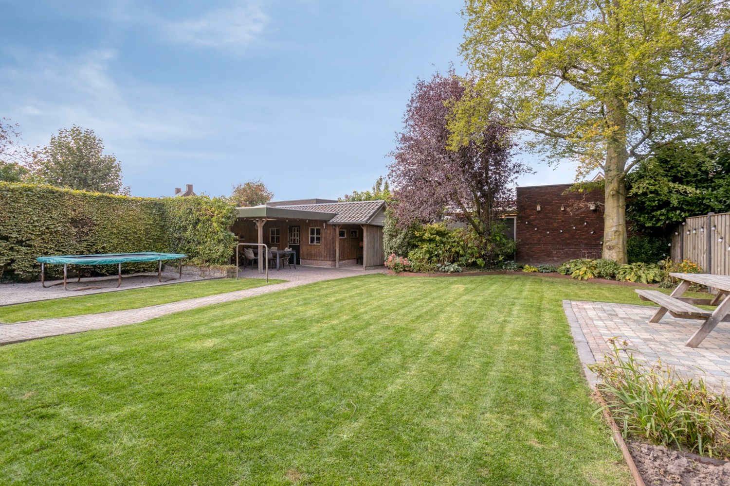 De achtertuin is ingericht met bestrating, gazon en diverse beplantingen. De diepe achtertuin biedt zeer veel privacy en ruimte. Op de achterzijde van het perceel is een houten berging met overkapping aanwezig. Er is een achterom met fietsenberging aanwezig via de zijkant van de woning.