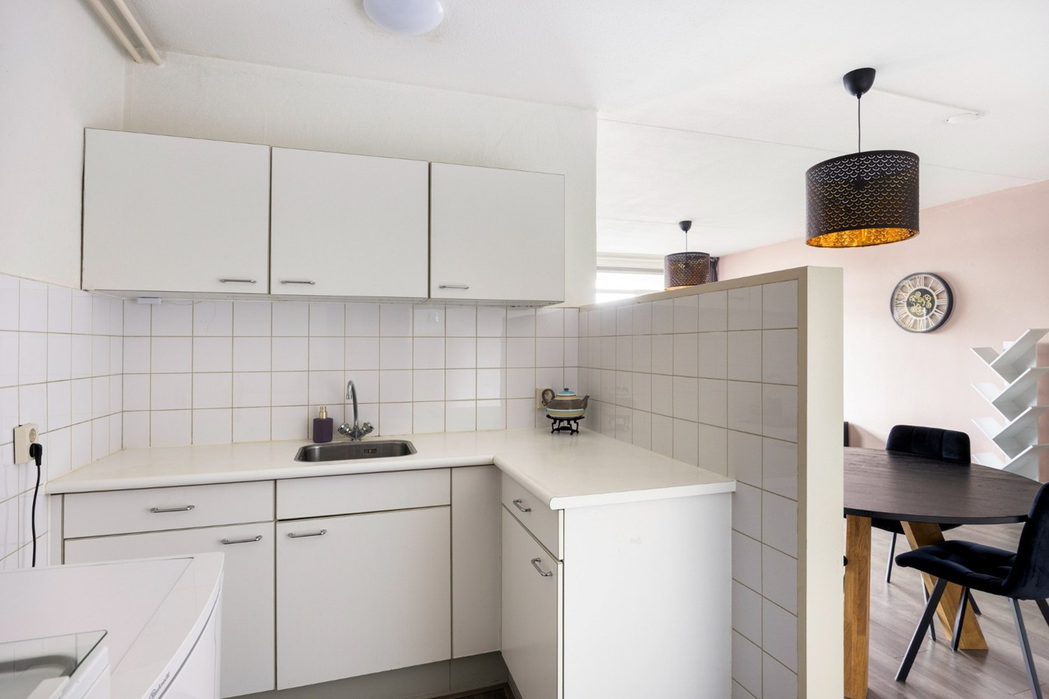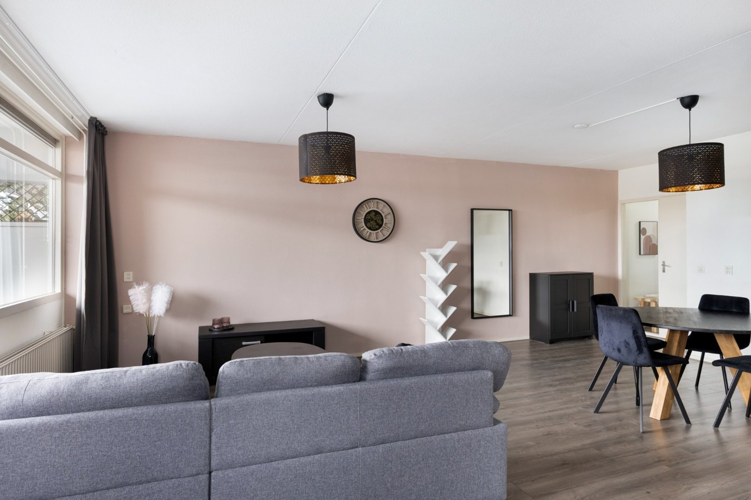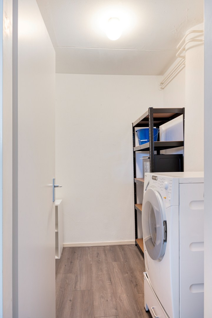 Royale woonkamer met zit- en eetgedeelte. De grote raampartijen zorgen voor veel lichtinval. De woonkamer is afgewerkt met een laminaatvloer, gestucte wanden en een spuitwerkplafond. Halfopen keuken met eenvoudige kunststof keukeninrichting met onder- en bovenkasten. Praktische berging met CV-opstelling (2024), mechanische ventilatie-unit en witgoedaansluitingen. Ook een ideale ruimte voor de voorraad en bergruimte.