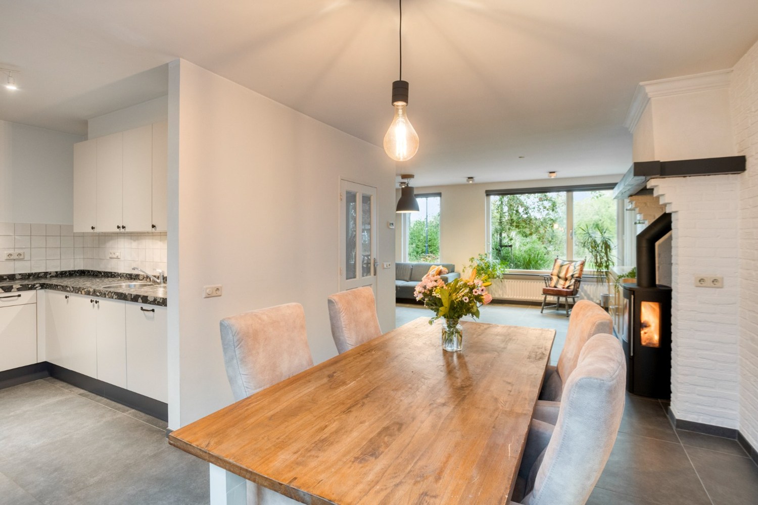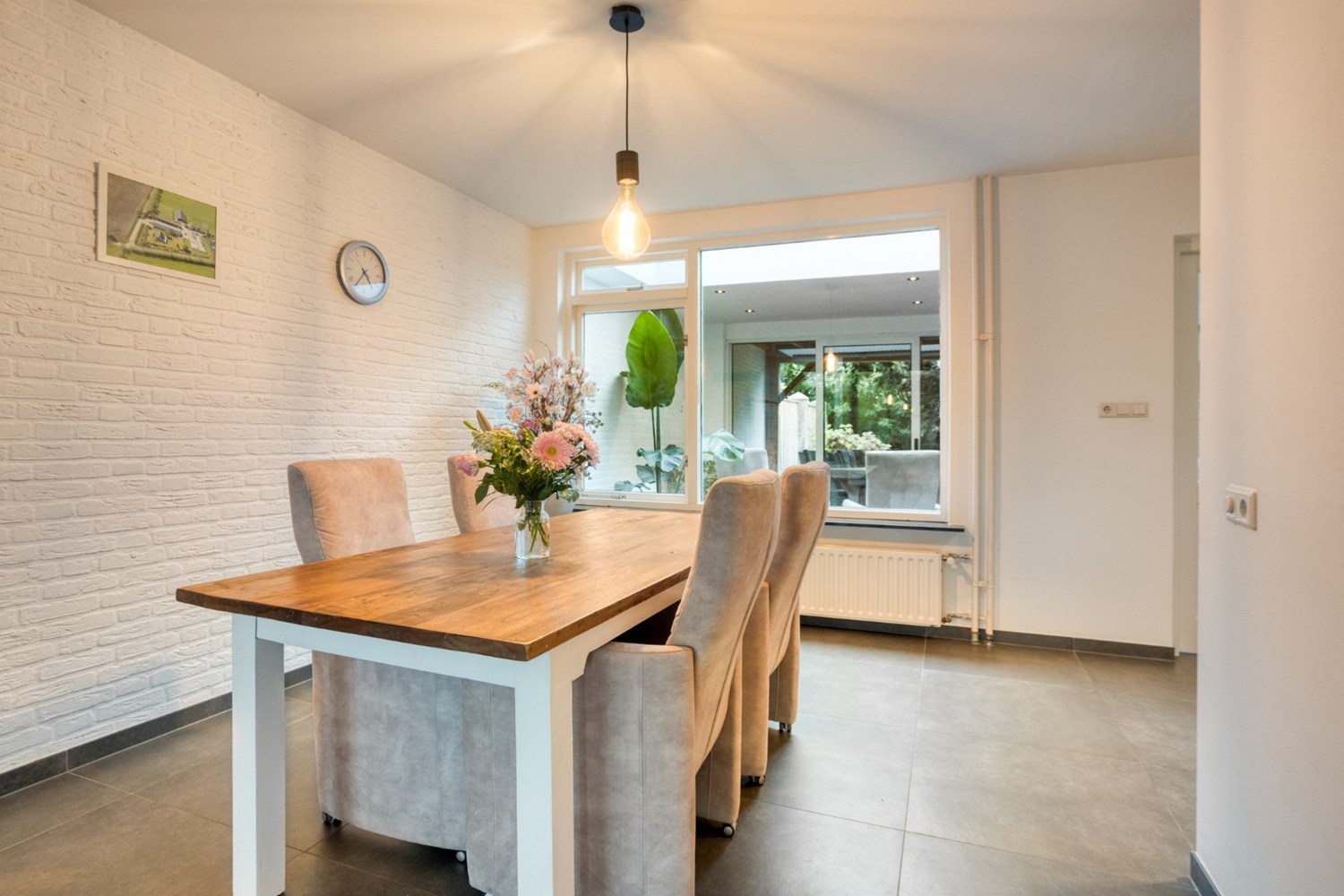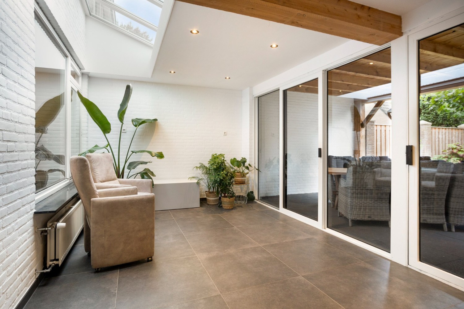 Halfopen keukeninrichting (2011) in een hoekopstelling voorzien van koelkast, gaskookplaat, rvs-afzuigkap, magnetron-oven en vaatwasser. Vanuit de keuken toegang tot de uitbouw aan de achterkant van de woning. De tuinkamer is afgewerkt met dezelfde tegelvloer met vloerverwarming en dankzij de grote raampartijen mooi zicht op de achtertuin. Via een grote aluminium schuifpui toegang tot de achtertuin. Vanuit de tuinkamer is de uitgebouwde garageruimte te bereiken. De garage/berging is afgewerkt met een tegelvloer en biedt meer dan voldoende ruimte voor opslag en dankzij de aanwezige witgoedaansluitingen ook uitermate geschikt om te gebruiken als wasruimte/bijkeuken.