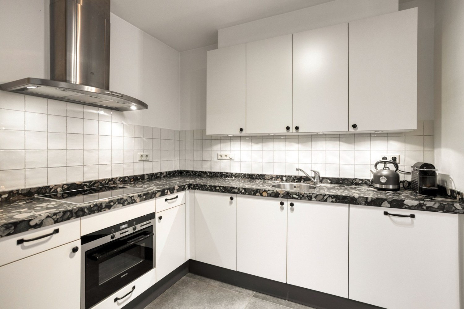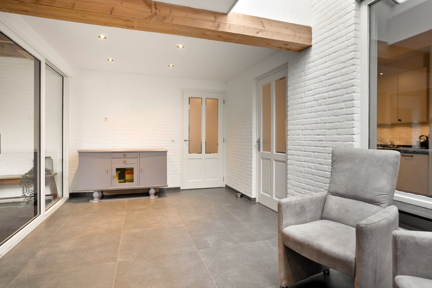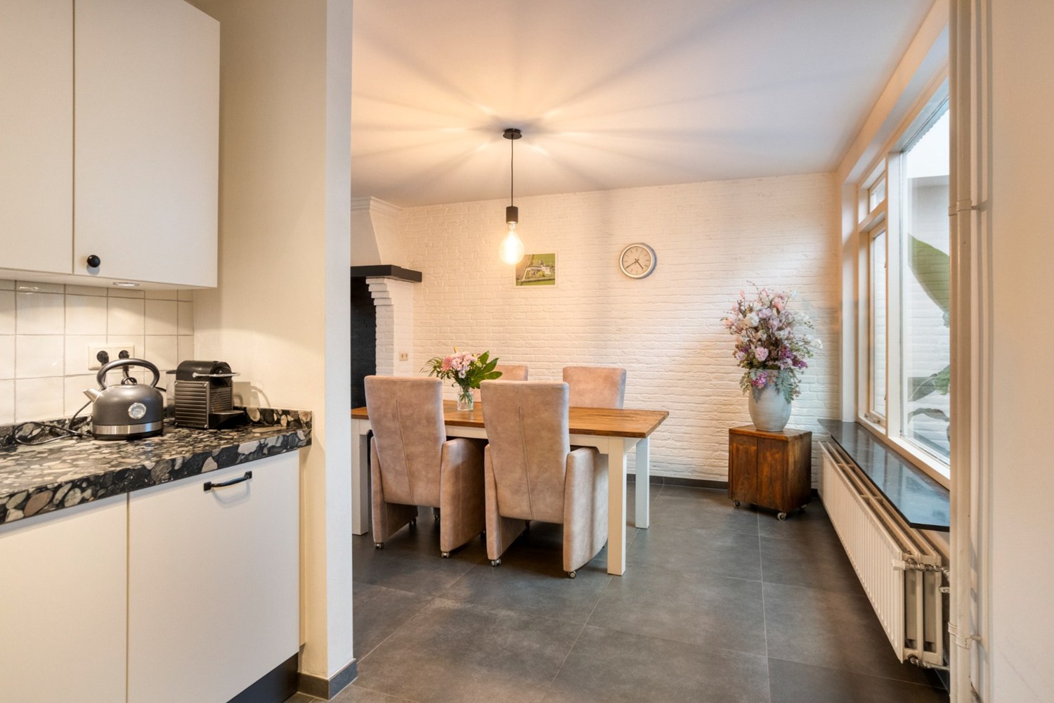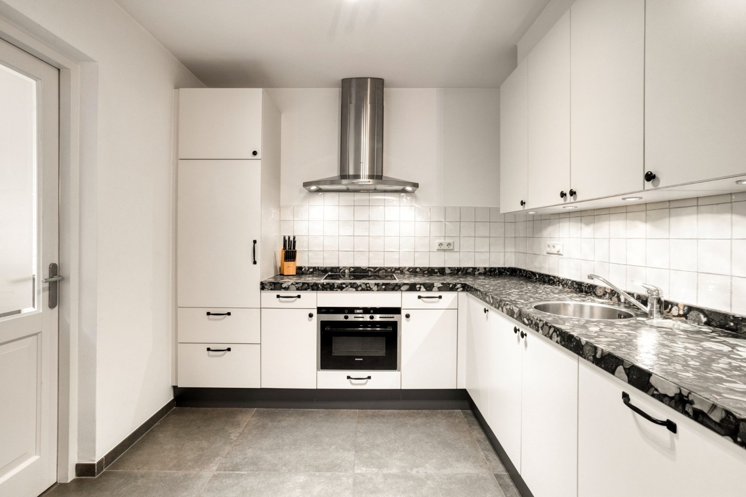 Halfopen keukeninrichting (2011) in een hoekopstelling voorzien van koelkast, gaskookplaat, rvs-afzuigkap, magnetron-oven en vaatwasser. Vanuit de keuken toegang tot de uitbouw aan de achterkant van de woning. De tuinkamer is afgewerkt met dezelfde tegelvloer met vloerverwarming en dankzij de grote raampartijen mooi zicht op de achtertuin. Via een grote aluminium schuifpui toegang tot de achtertuin. Vanuit de tuinkamer is de uitgebouwde garageruimte te bereiken. De garage/berging is afgewerkt met een tegelvloer en biedt meer dan voldoende ruimte voor opslag en dankzij de aanwezige witgoedaansluitingen ook uitermate geschikt om te gebruiken als wasruimte/bijkeuken.