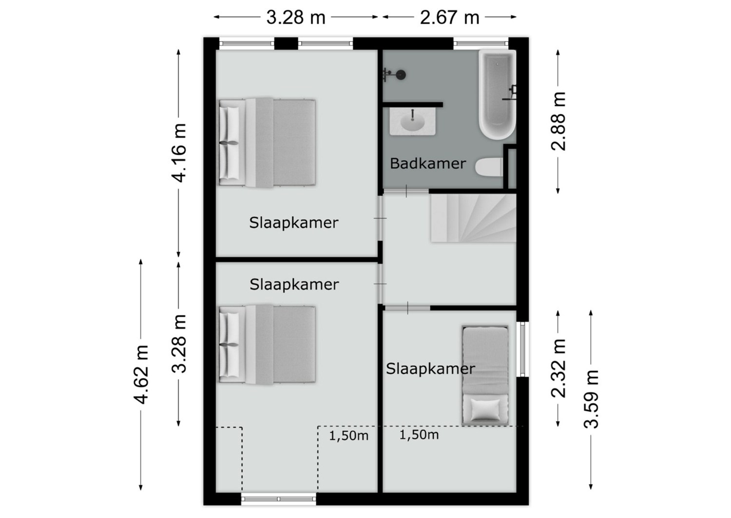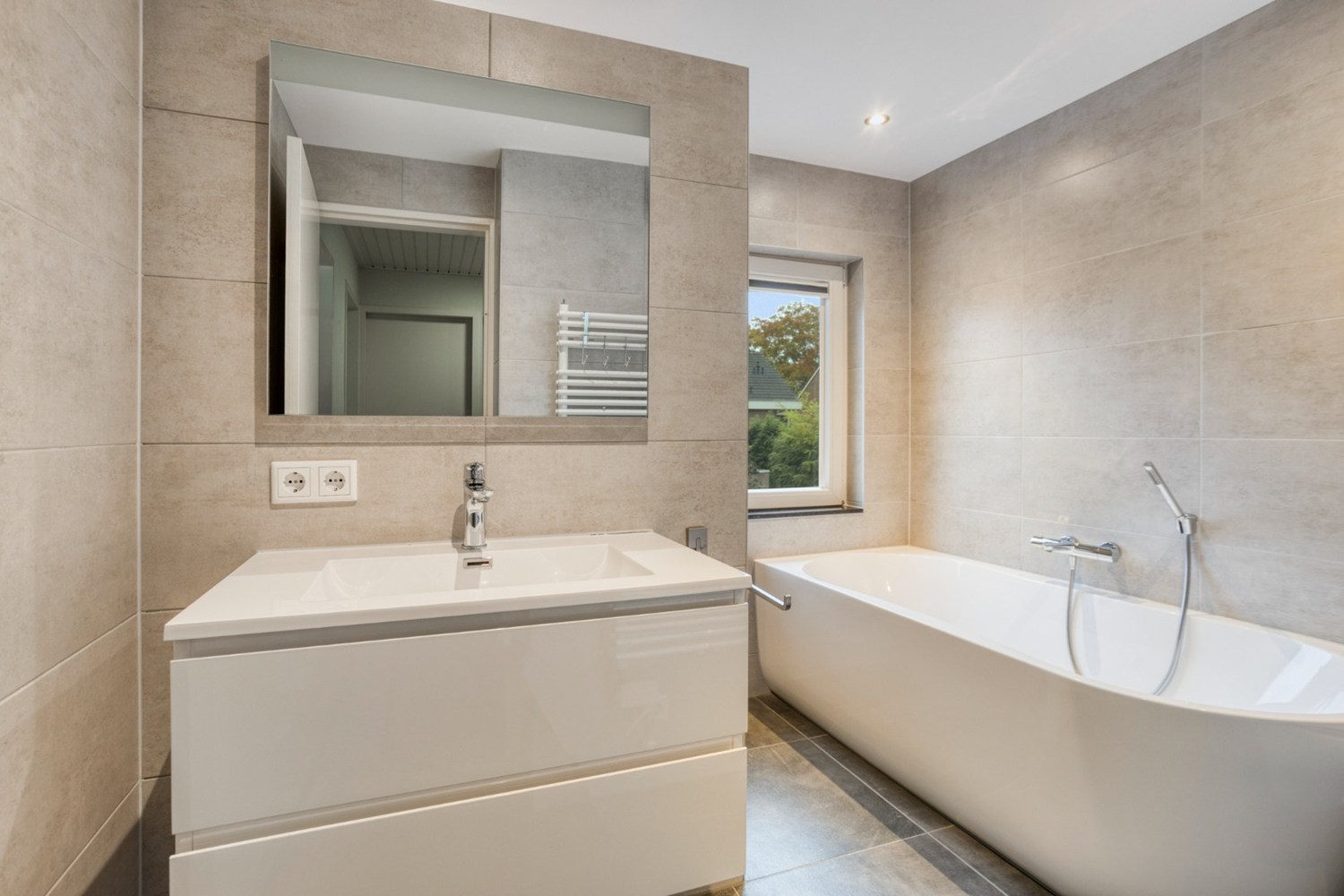 Overloop met toegang tot drie slaapkamers en de badkamer. De slaapkamers zijn afgewerkt met een vinylvloer, gestucte wanden en stucwerk plafond. De badkamer is in 2019 vernieuwd en is prachtig afgewerkt en ingericht met een inloopdouche, wandmeubel met wastafel, hangend toilet, ligbad en designradiator. Via een vaste trap toegang tot de zolderverdieping.