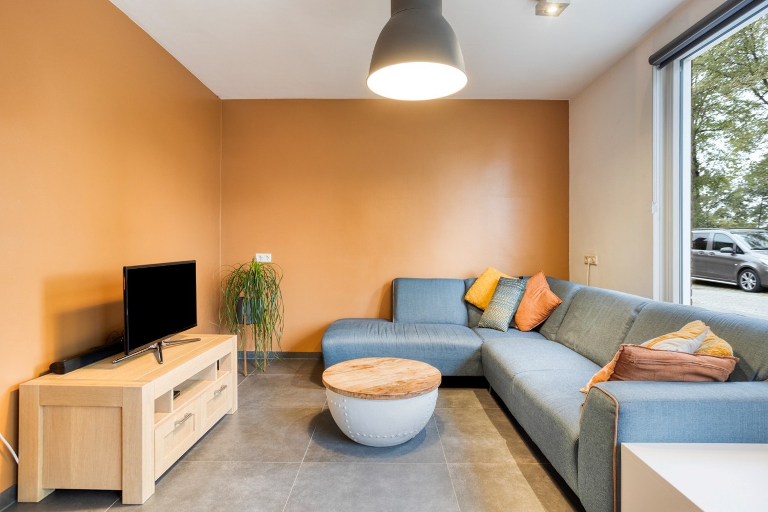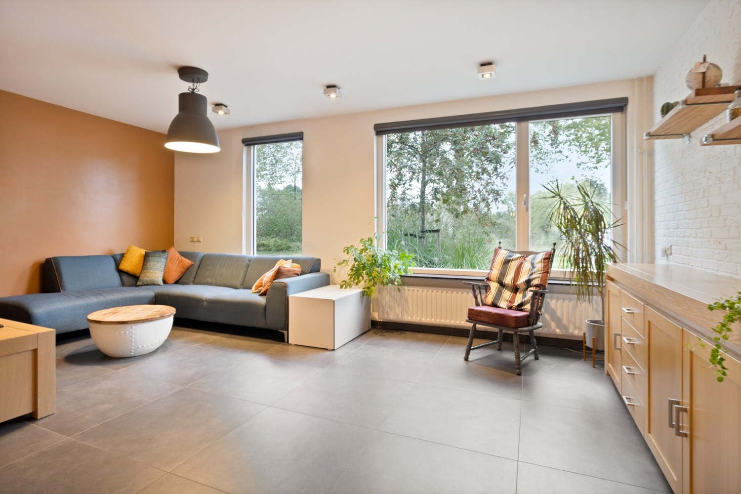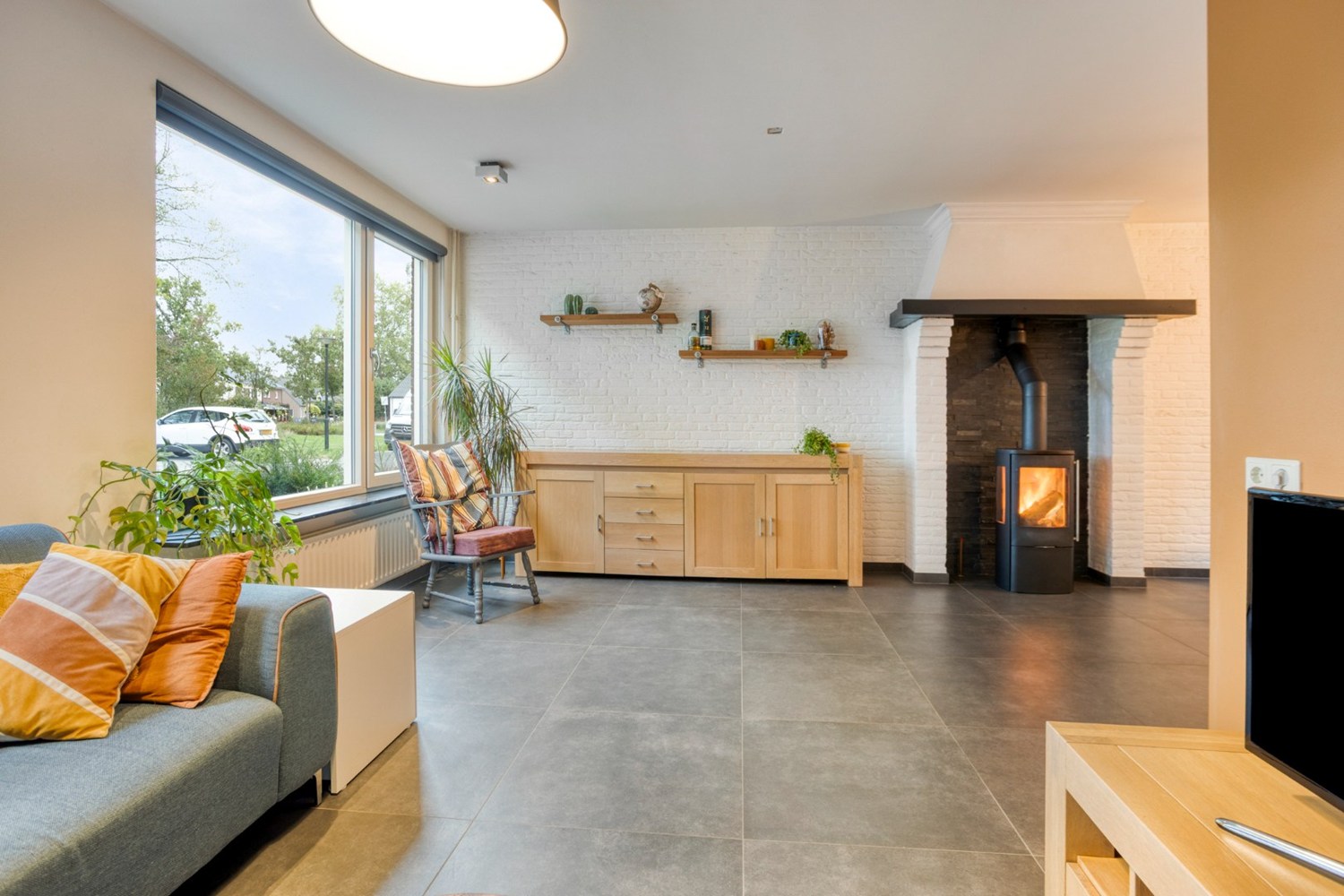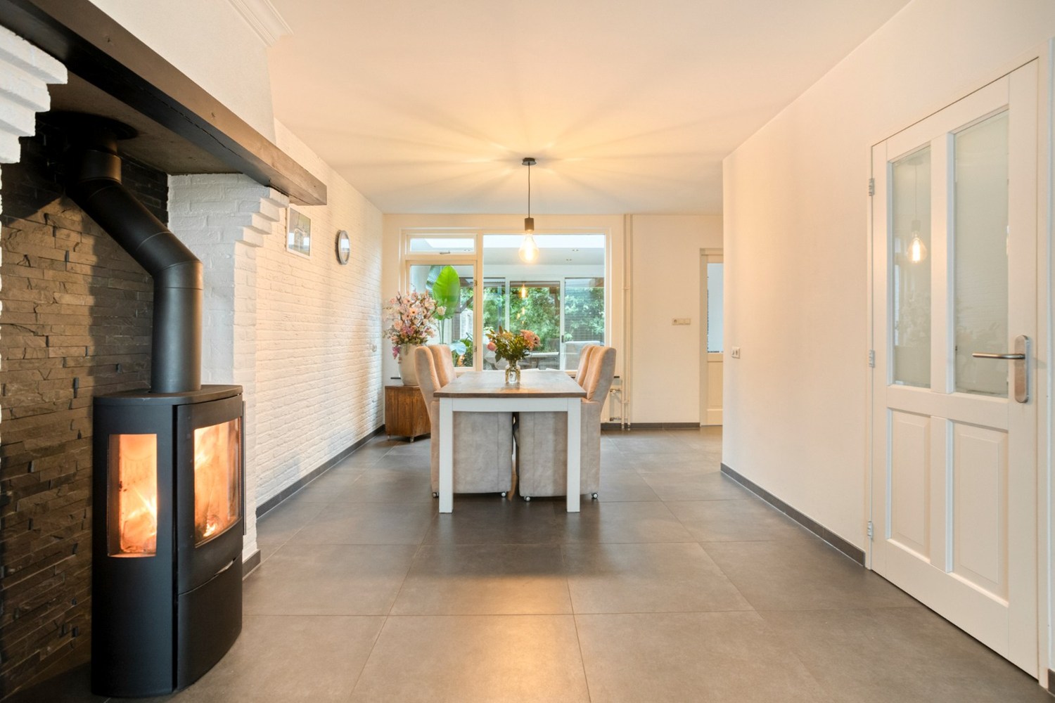Entree aan de zijkant van de woning, hal met meterkast, geheel betegelde toiletruimte met hangend toilet en fonteintje en trapopgang naar de 1e verdieping. Ruime L-vormige woonkamer met ruime zithoek en aparte eetgedeelte. De woonkamer is afgewerkt met een moderne tegelvloer met vloerverwarming, gestucte wanden en een strak stucwerk plafond. Sfeervolle houtkachel aanwezig.