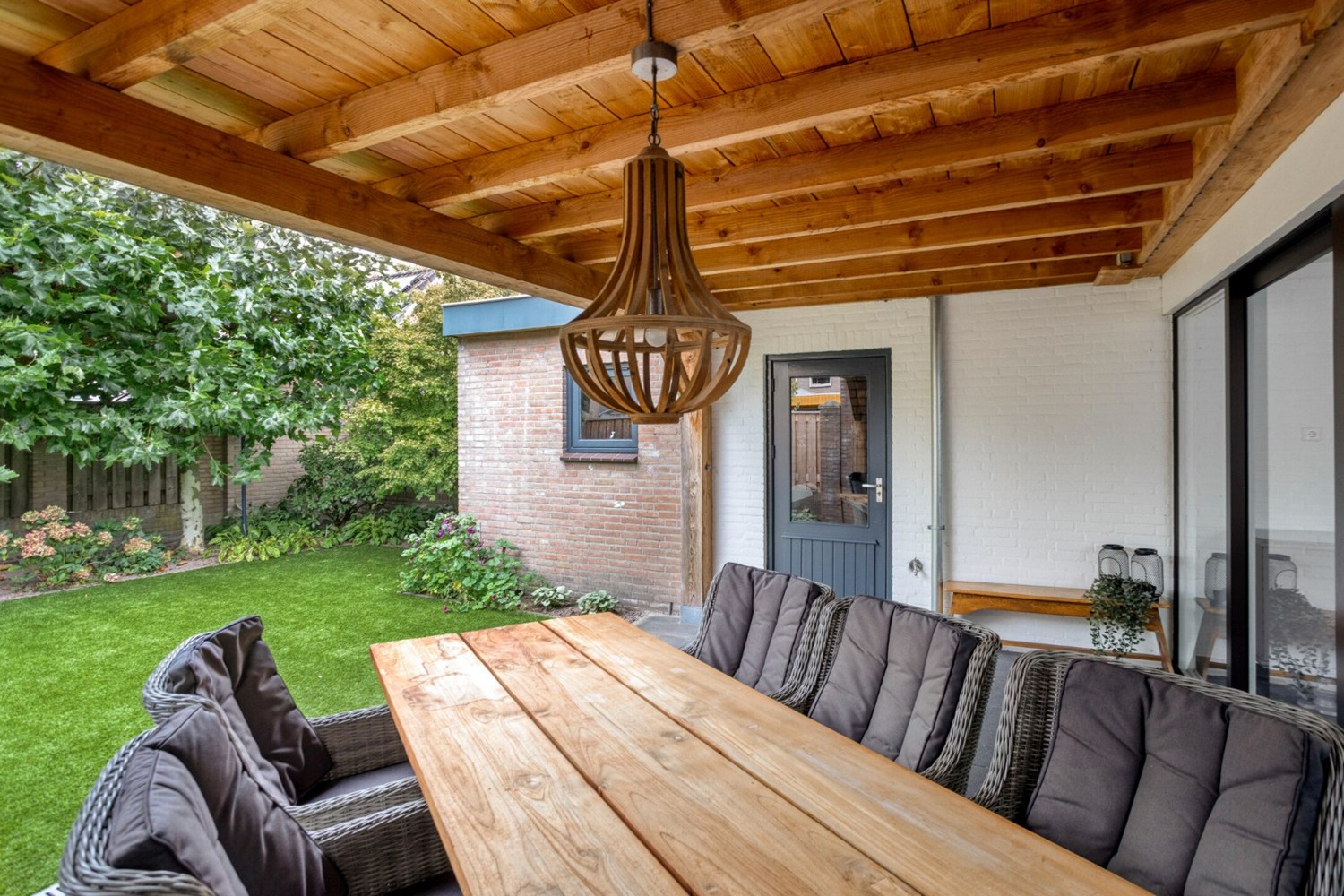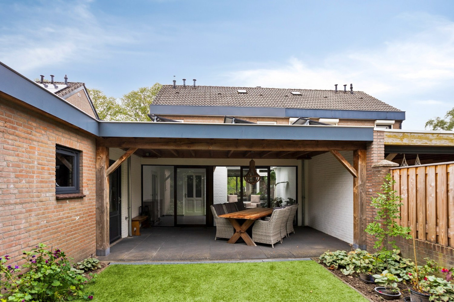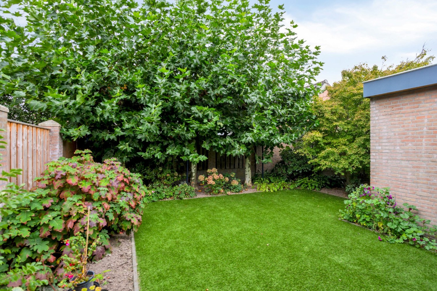 Achtertuin ingericht met kunstgras, borders met diverse beplantingen en een terras aan de achterzijde van de woning. Zeer fraaie overkapping met buitenzitje tegen de achtergevel van de woning. De aanwezige platanen aan de achterzijde van het perceel zorgen voor veel privacy in de achtertuin. Vanuit de achtertuin toegang tot de buitenberging.