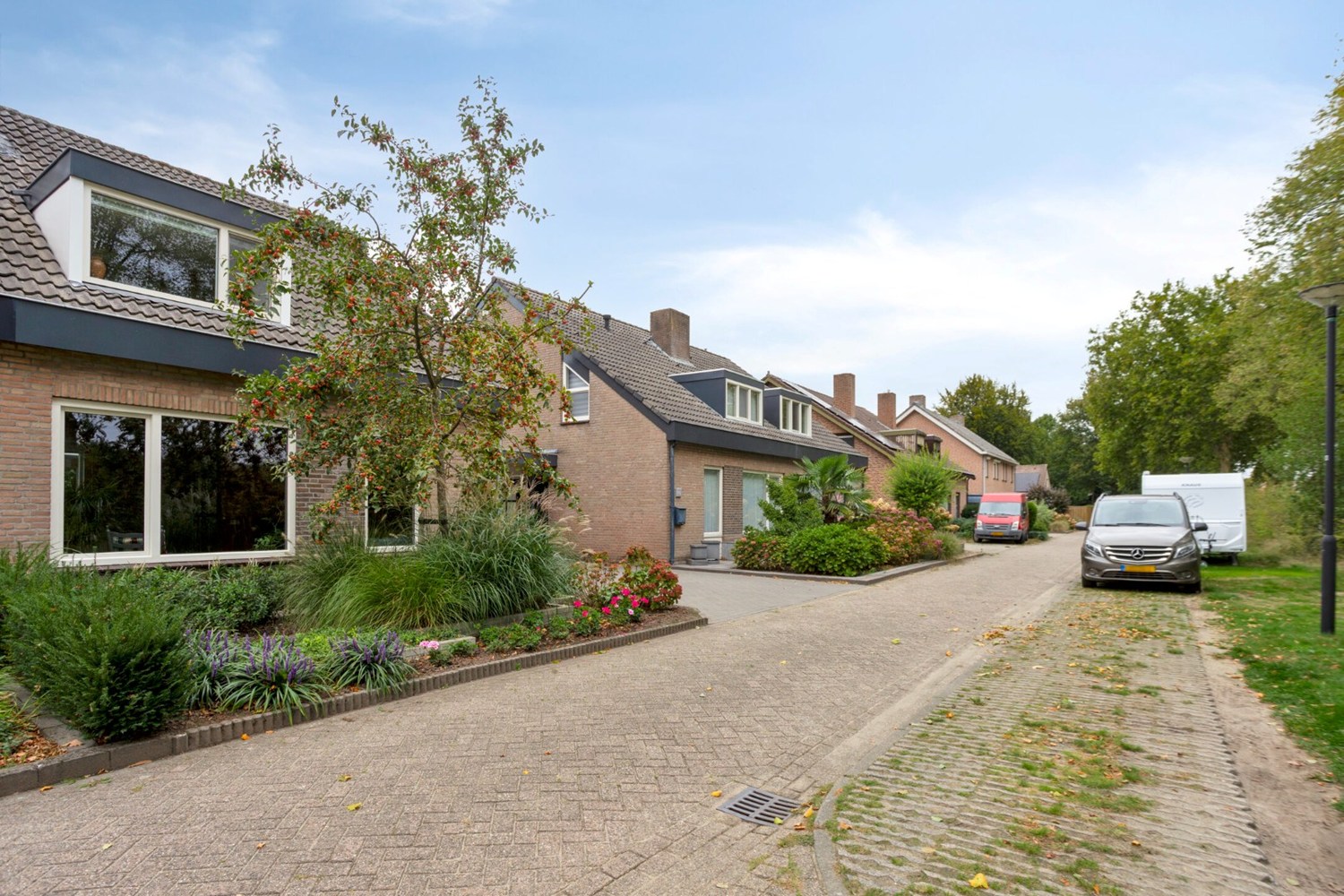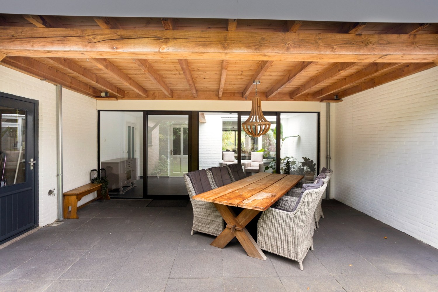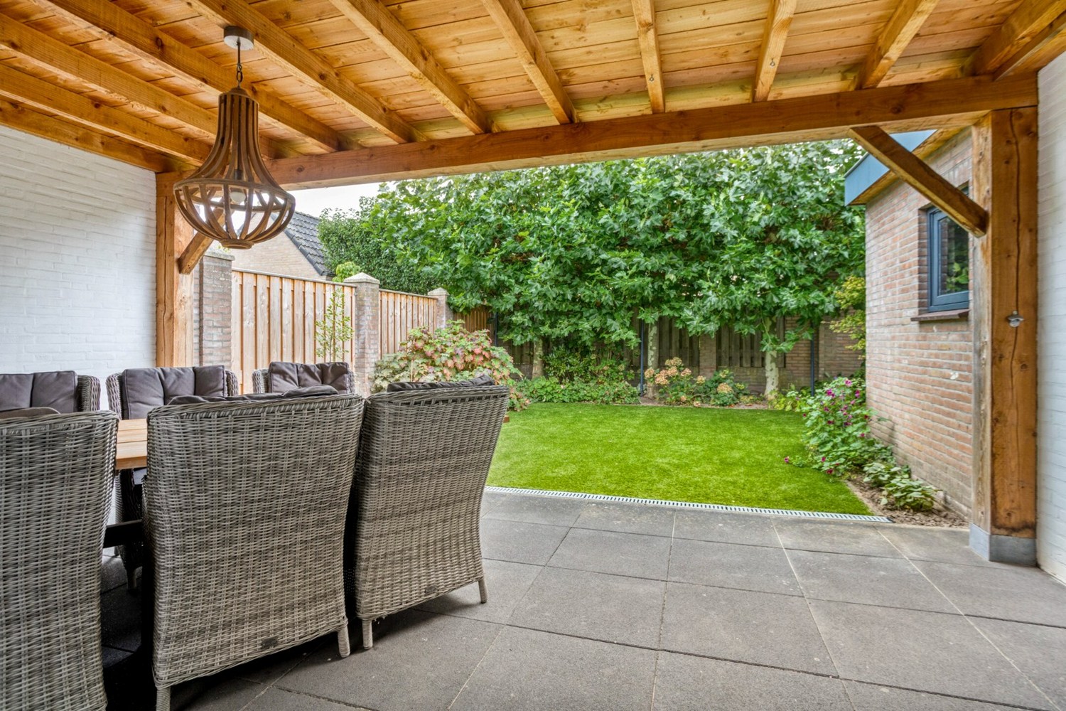 Achtertuin ingericht met kunstgras, borders met diverse beplantingen en een terras aan de achterzijde van de woning. Zeer fraaie overkapping met buitenzitje tegen de achtergevel van de woning. De aanwezige platanen aan de achterzijde van het perceel zorgen voor veel privacy in de achtertuin. Vanuit de achtertuin toegang tot de buitenberging.